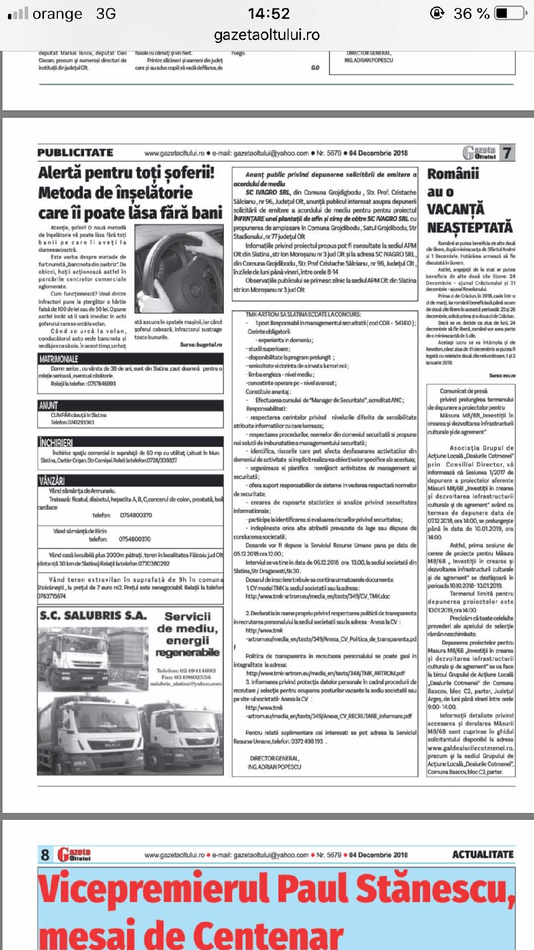 - Măsura M2-2A ,,Modernizarea exploatațiilor agricole în teritoriul GAL ,,Dealurile Cotmenei” -publicat in data de 05.10.2017
